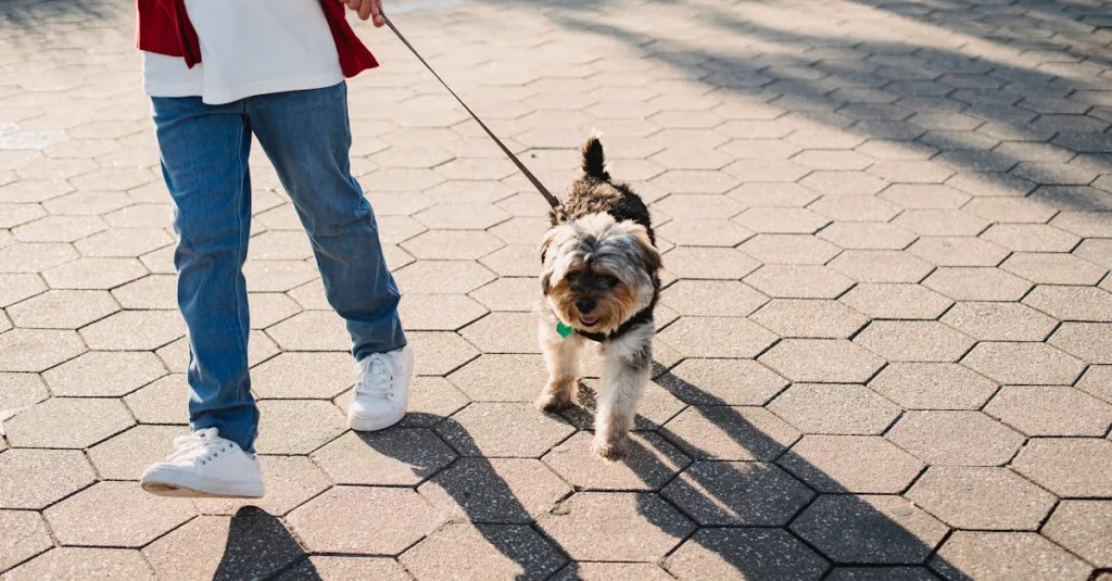 Crop anonymous kid in casual wear strolling on urban pavement with Yorkshire Terrier in sunlight